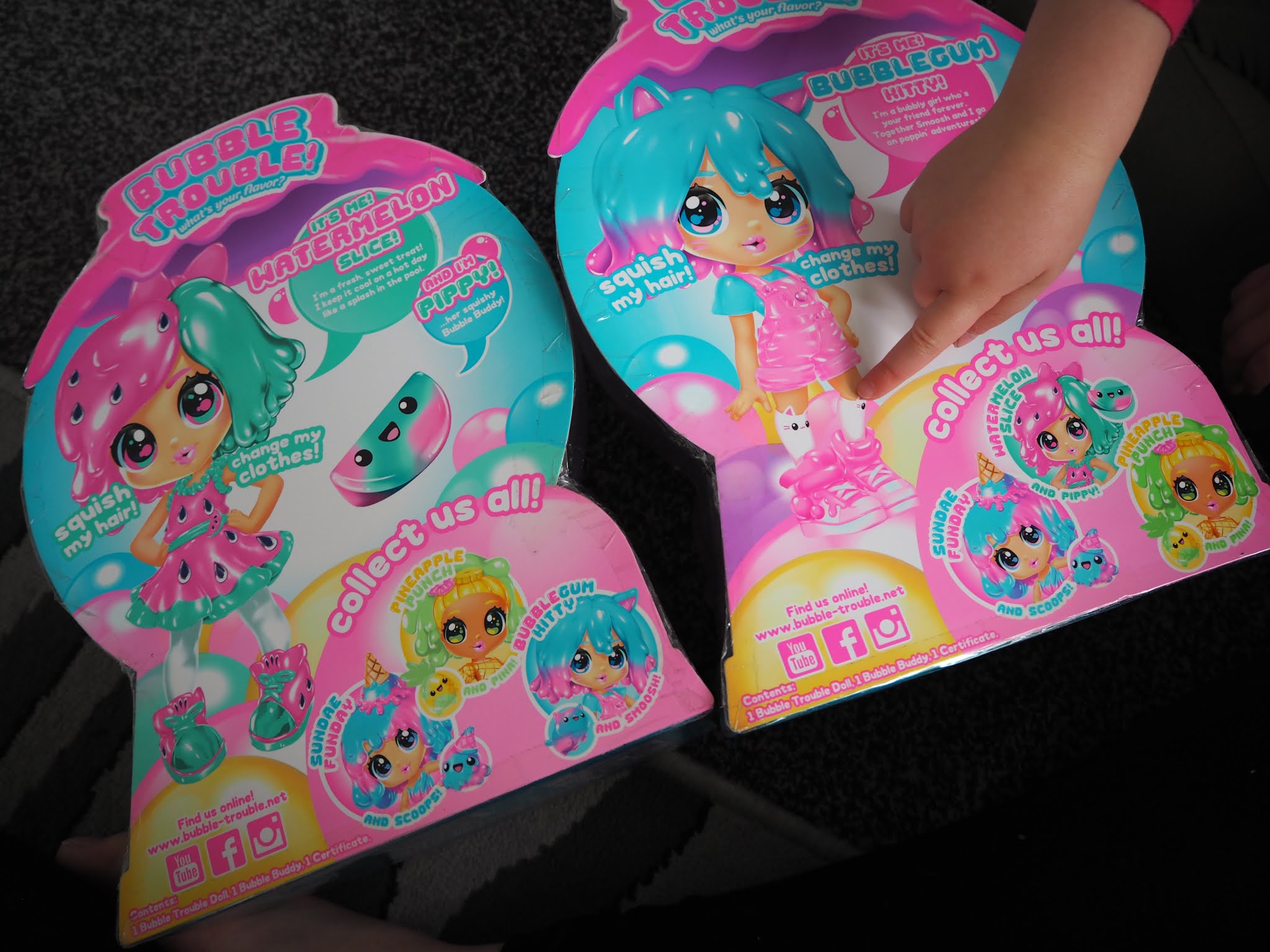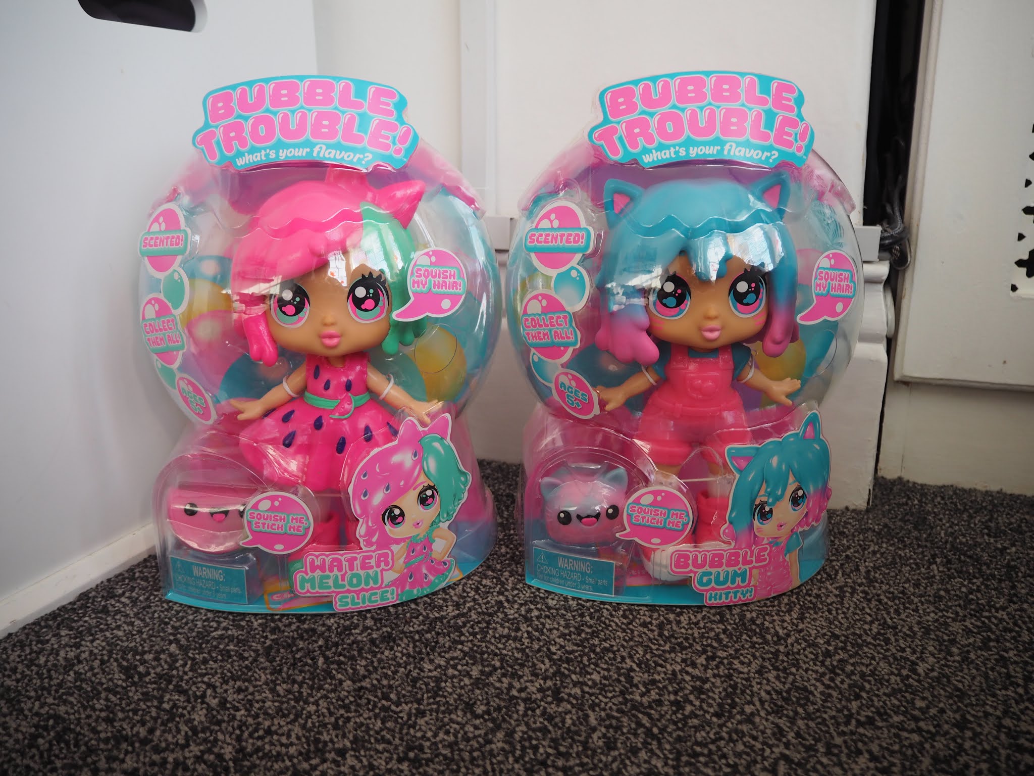 Bubble Trouble dolls are squishy smooshy cuties come to life inside a gumball machine They are scrumptiously scented and ready to be squeezed, and just like bubblegum they are bursting with flavour and squooshiness Stretchy, scented hair and soft, squishy outfits, each one has a sticky, smooshy Bubble Buddy bestie. Bubble Trouble Doll Watermelon Slice Bubble Trouble dolls are squishy smooshy cuties come to life inside a gumball machine They are scrumptiously scented and ready to be squeezed, and just like bubblegum they are bursting with flavour and squooshiness!. Each Bubble Trouble doll has an adorable name and Erin’s dolls were called Watermelon Slice and Bubblegum Kitty Also available are Pineapple Punch and Sundae Funday Each of the Bubble Trouble dolls comes with an adorable outfit, a squishy friend and a certificate of authenticity.