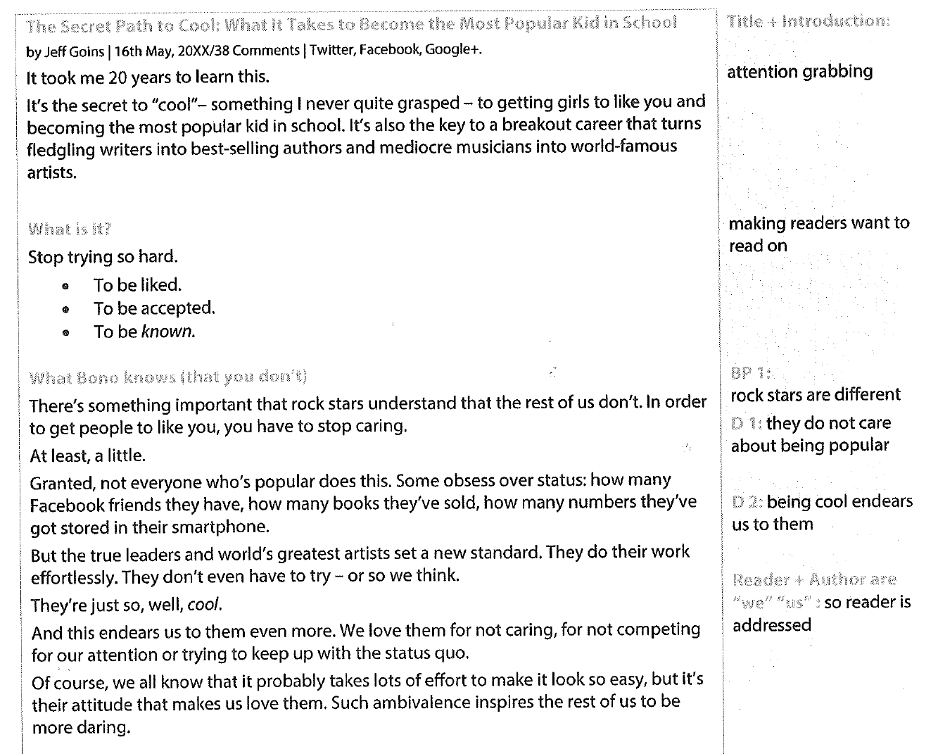 Suggest what people can do to be more popular. Section 4 – Optimizing a Blog Post How to optimize a blog post for onpage SEO, social shares/engagement, etc Section 5 – Conclusion Wrapup The purpose of this outline is to make sure I know what I plan to cover, in what order the various sections will appear, and some barebones details of what each section will include. Write a blog entry in response to the event (If you’d like student posts to be anonymous for the purpose of activity 5, ask students to submit two copies of their post—one labeled with their name and one without a name) Give students parameters for the post including required elements and approximate word count.