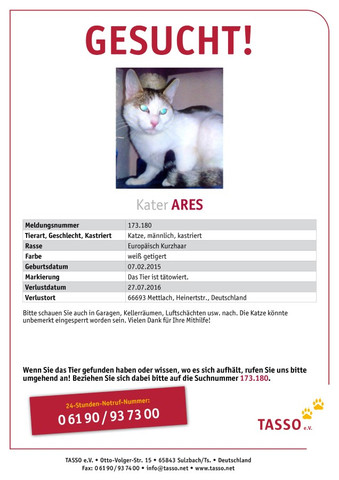 Ist Ihr Tier im Sinne von TASSO vermisst und Sie haben das Suchplakat bestellt, wird automatisch eine TASSOSuchmeldung auf unserer Internetseite veröffentlicht Zu Ihrer Sicherheit und um eine Abzocke zu vermeiden , erscheinen auf dem Plakat und im Internet nicht Ihre persönlichen Daten, sondern die Kontaktdaten von TASSO eV Jeder. * Wenn Ihnen Ihre Katze erstmalig raushuscht, auf keinen Fall hinterherlaufen!!!. Wer vorsorgt, hat es im Notfall leichter seinen vermissten Liebling wiederzufinden Am besten ist es, den Hund oder die Katze vom Tierarzt mit einem Chip und mit einer Tätowierung (am Ohr) versehen zu lassen.