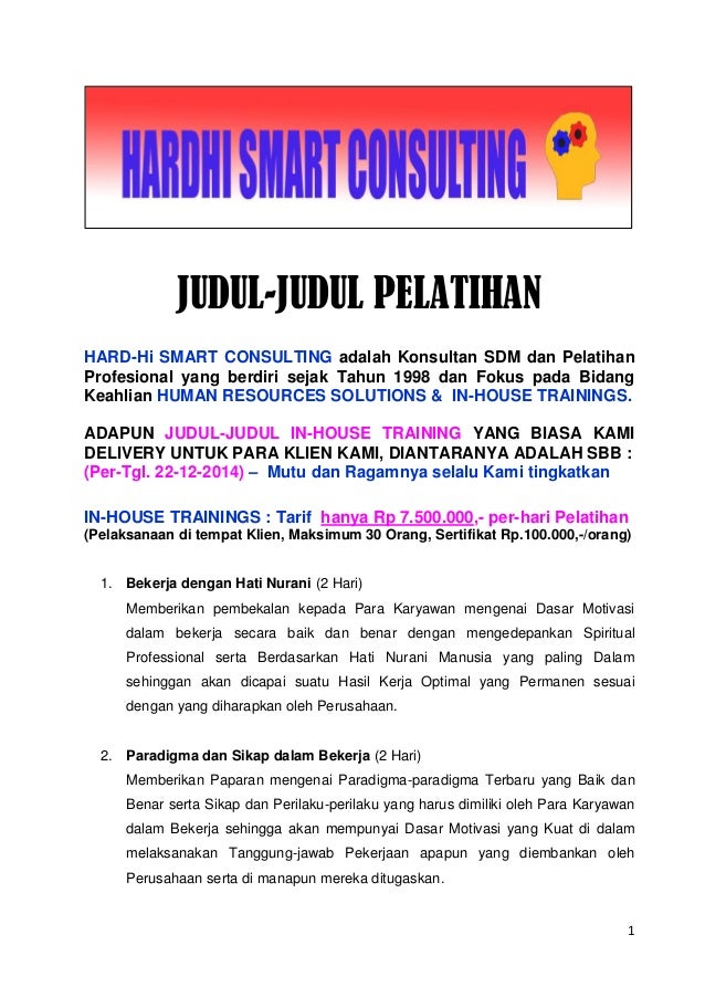 InHouse Training KDV understands that the key to a successful organization comes from a preemptive approach Uptodate training and awareness of the changing legal and business landscapes allows potential liabilities to be prevented before they arise The attorneys at KDV are able to provide inperson training presentations to management. In House Training (IHT) Secara umum, Basri dan Rusdiana (15 227) mengemukakan bahwa In House Training adalah program pelatihan yang diselenggarakan di tempat peserta pelatihan atau di sekolah dengan mengoptimalkan potensipotensi yang ada di sekolah, menggunakan peralatan kerja peserta pelatihan dengan materi yang relevan. Inhouse Training InHouse Training adalah sebuah bentuk program pelatihan, dimana materi pelatihan, waktu serta tempat pelatihan ditentukan sesuai dengan yang diminta dan dibutuhkan oleh peserta atau perusahaan yang meminta Materi In House Training.