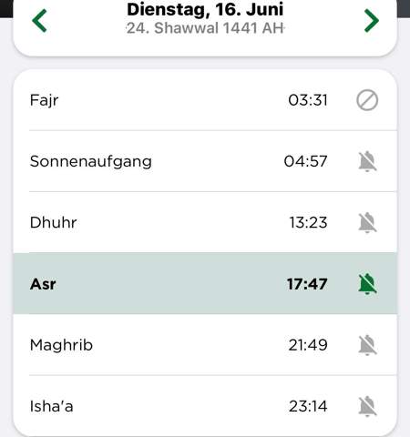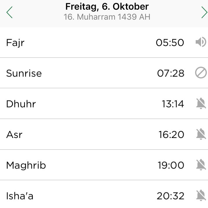Wenn Fadschr oder Ischaa in nördlichen Ländern verschwinden, schaltet die Liste auf die Methode der MWL zur Berechnung der Gebetszeiten in extremen Latituden Am ersten der Umstellung macht die Liste einen Sprung Benutzen Sie unsere Zeiten nur wenn Sie den Sonnenaufgang und Untergang nicht selber beobachten können Informieren Sie uns. Oder Du hast nicht darauf geachtet, wie du dein Geld verdient hast, und jetzt achtest du darauf, dass du dein. Dämmerung AlFadschr (Laut) 2 Rak`at Einheiten Vom ersten Morgenlicht bis zum Sonnenaufgang 2 Rak`at Einheiten vor dem Gebet Wenn es ein Gebet mit drei Einheiten ist, wie zB das Abendgebet, oder mit vier Einheiten, wie das Mittags, Nachmittags und Nachtgebet,.