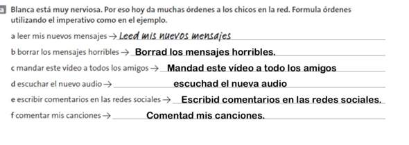 Bildung des verneinten Imperativ im Spanischen (imperativo negativo) Die Bildung des verneinten Imperativs ist einfacher als die des bejahten Imperativs Die Verben haben fast die selben Endungen wie im Präsens, allerdings mit einem Vokalwechsel in der Endung Verben auf ar haben also die gleichen Endungen wie Verben auf er im Indikativ Präsens Verben auf er bzw ir die gleichen Endungen wie Verben auf ar im Indikativ Präsens. B1 Intermediate I » Imperativo Grammar Exercises Group 1 Imperativo;. 22ene19 Explora el tablero "Imperativo" de Profe de ELE Y, que 1050 personas siguen en Ver más ideas sobre el imperativo, clase de español, lenguas extranjeras.