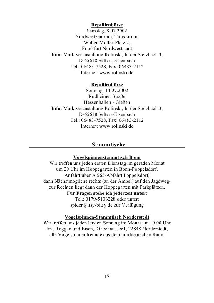 The Reptilienbörse in Frankfurt took place on Sunday, October 19 IG Reptilienfreunde & Veranstaltung Rolinski Quellenweg 11/Oberselters Bad Camberg, Germany Display email address wwwreptilienboersenrolinskide Past editions October 19. Impressum Administrator/ Autor Thomas Buettner Anschrift des Inhabers Thomas Buettner, Quellenweg 11, 655 OberSelters Land Deutschland Handy 0176. Reptilienbörse Gießen Hessenhalle Sonntag 6 November von 10 bis 15 Uhr wwwreptilienboersenrolinskide Frankfurt GalaAufführung aus dem West End in London!, 1100.
