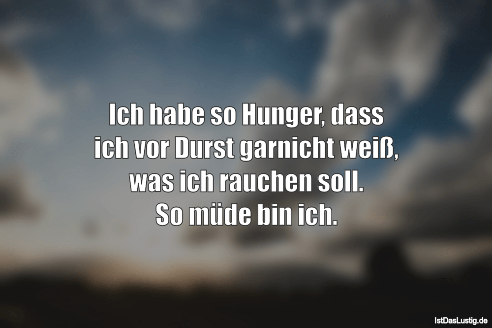 Ich hab so Hunger, dass ich vor lauter Durst gar nicht weiß was ich rauchen soll, so müde bin ich!!!. A Jetzt denk nicht ans Essen , sag. Wenn dir das gefallen hat, dann teile bitte diesen Spruch Teilen Spruchbild Nächster Spruch;.