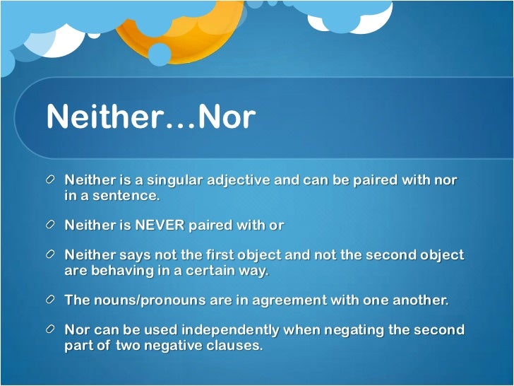 Neither Nor Correlative Conjunction Usage Correlative Conjunctions Always Join Grammatically Equal Elements E G Noun Noun Adjective Adjective Ppt Download