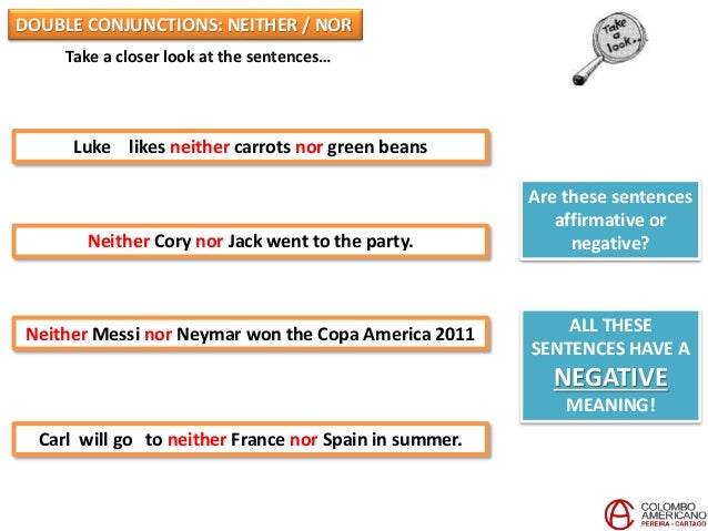 Beware Double Negatives with 'Neither/Nor' The pairing "neither/nor" plays a negative role in a sentence. So and neither / nor 1. Neither in general nor in detail do I agree with you.