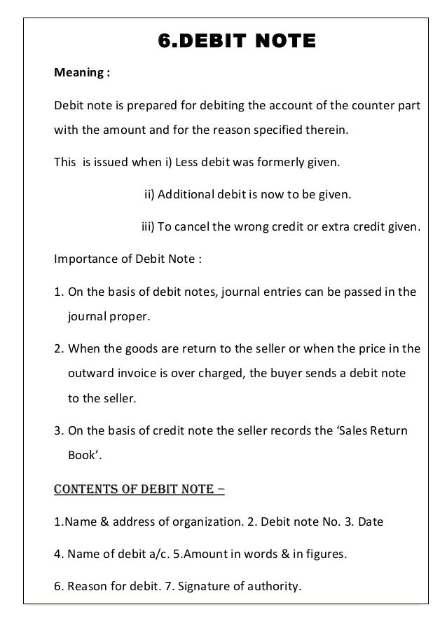 A credit note in GST is a document issued by the supplier to Supplies are returned or found to be deficient by the recipient – When goods/services supplied are returned/found to be deficient by the recipient, the supplier will issue a Credit Note It reduces the value of the original supply. Meaning of Debit Note & Credit Note This Article contains Detailed Information about Debit Note & Credit Note Debit note is a note sent by one party to another informing him that his account is debited in the sender's book eg P (Purchaser) Purchased goods from S (Seller). Credit note a document issued by a supplier to a customer giving the customer CREDIT for any products returned by the customer for which payment has already been received Collins Dictionary of Business, 3rd ed © 02, 05 C Pass, B Lowes, A Pendleton, L Chadwick, D O’Reilly and M Afferson Want to thank TFD for its existence?.